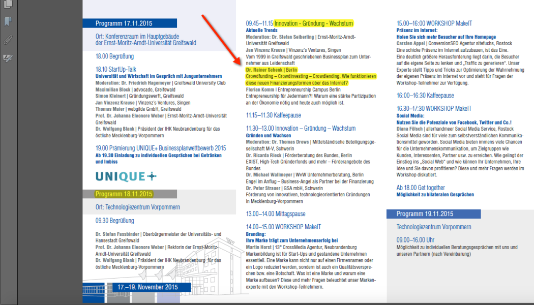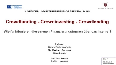 Am 18.11.2015 halte ich im Rahmen der Veranstaltung 3. Gründer- und Unternehmertage Greifswald 2015 einen Vortrag zum Thema Crowdfunding (#Crowdfunding - #Crowdinvesting - #Crowdlending; Wie funktionieren diese neuen Finanzierungsformen über das Internet?