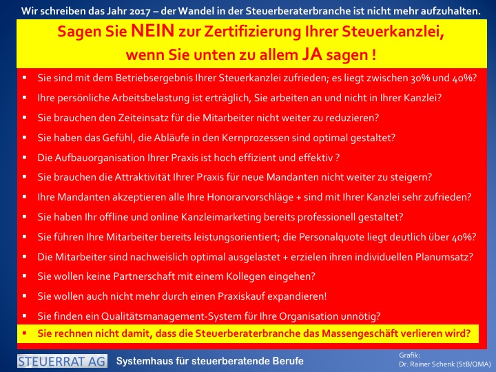 Der Berufsstand der Steuerberater ist zum Teil nicht bereit, sich Innovationen zu öffnen. Solange der Ertrag bei diesen Steuerkanzleien mit dem Standardgeschäft stimmt, kommt es zu keinen oder nur zeitlich verzögerten Innovations- und Anpassungsbewegungen.