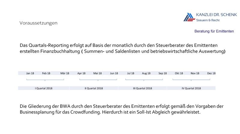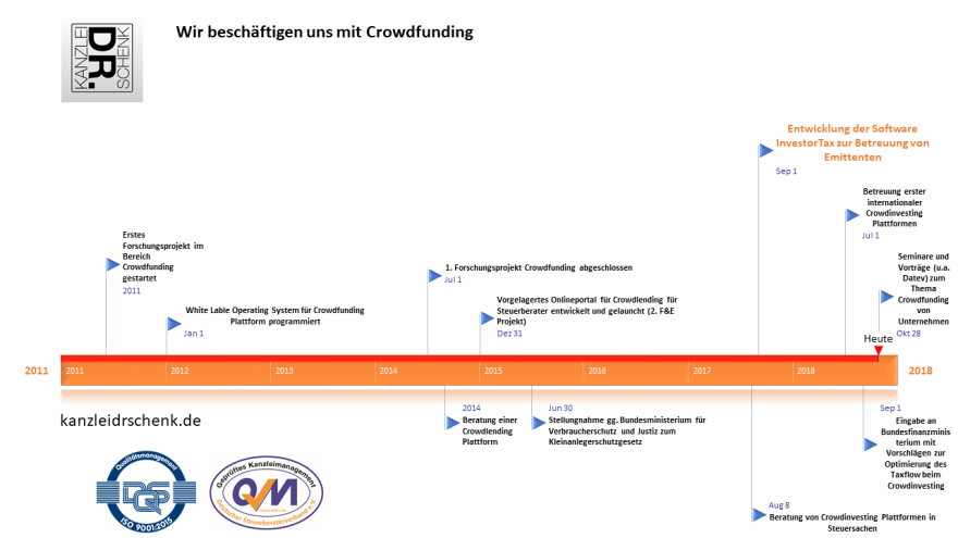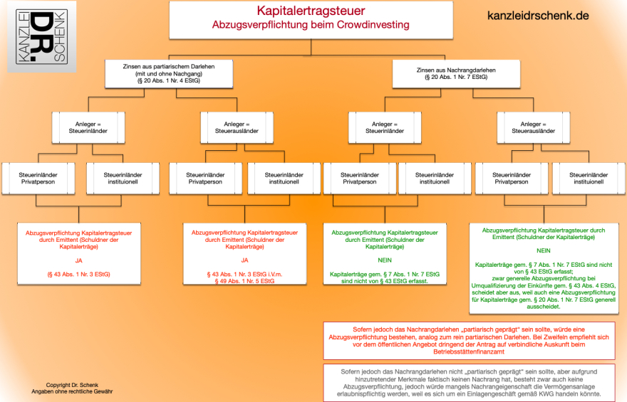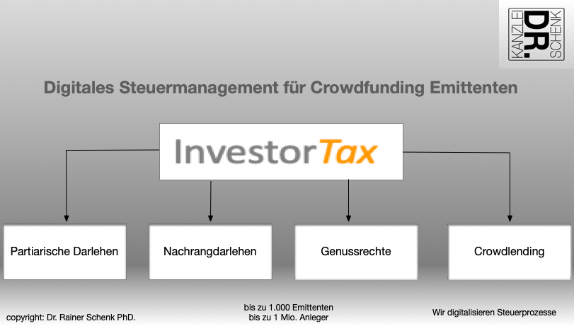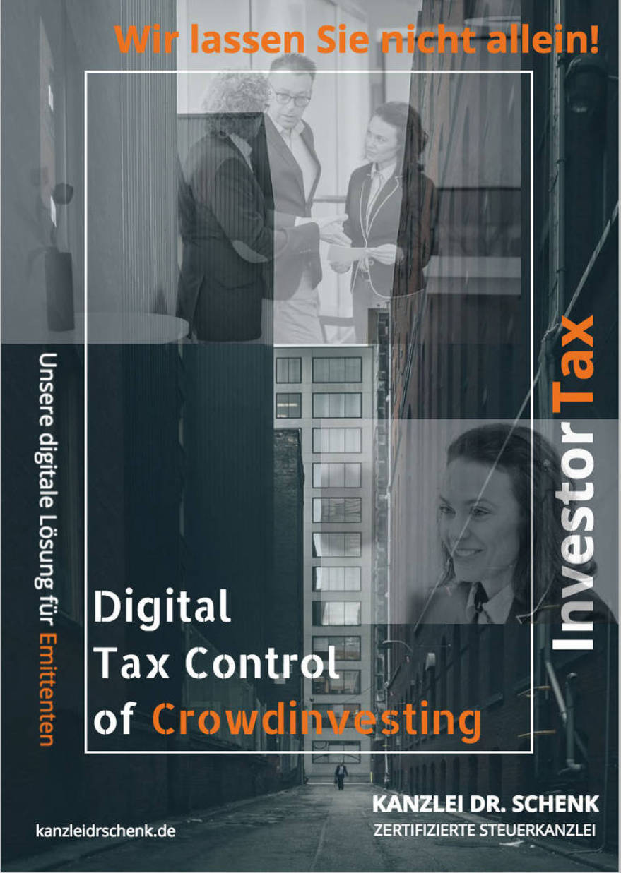 Wir von der zweifach zertifizierten KANZLEI DR. SCHENK erledigen für Sie den gesamten TaxFlow beim Crowdinvesting. Wir übernehmen für den Emittenten die Gesamtverantwortung für den Bereich Kapitalertragsteuer und Abzugsverpflichtung . Unser guter Ruf beruht nicht zufällig auf unserer Zuverlässigkeit, Professionalität und IT-Kompetenz.