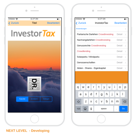 Unsere bisherige browserbasierte Softwarelösung InvestorTax werden wir zukünftig als mobile Variante einsetzen können. In der nächsten Entwicklungsstufe soll diese Applikation (APP) auch auf den unterschiedlichen mobile Devices laufen. Dadurch können wir InvestorTax sogar anderen Steuerkanzleien zum Einsatz für deren Mandanten (Emitenten) anbieten. Mit der APP verwalten Emittenten ihre gesamten Daten, laden Datensätze zur Verarbeitung hoch und greifen anschließend auf die Arbeitsergebnisse zu.