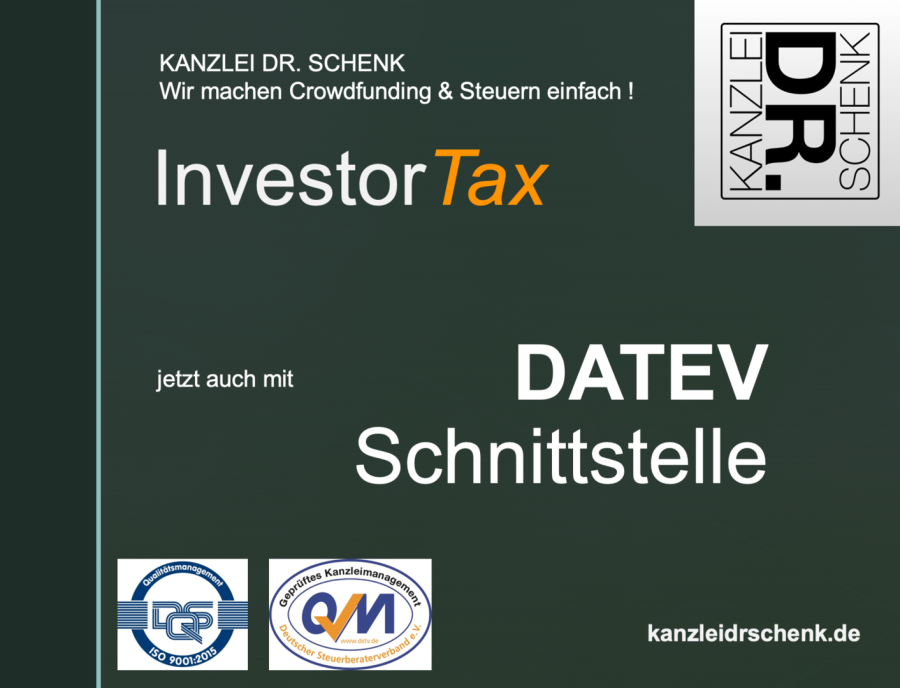 Die von uns selbst entwickelte Steuer-Software InvestorTax für Crowdinvesting Projekte verfügt nun auch über eine DATEV Schnittstelle. Somit können wir den Steuerberatern bzw. den Emittenten für die Verbuchung der gesamten Steuersachverhalte automatisiert die Buchungssätze über eine Schnittstelle zur Verfügung stellen.